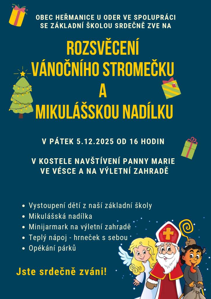 Děti s jiným trvalým bydlištěm nebo sourozenci žáků naší školy se musí jmenovitě hlásit na tel. 724189245 (starostce obce) do pondělí 1.12.2025 do 17 hodin.