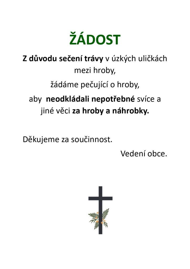 Obracíme se s žádostí na pečující o hroby na hřbitově v místní části Véska, aby z důvodu sečení neodkládali nepotřebné věci za hroby a náhrobky. Upozorňujeme také, že v měsíci srpnu budou na hřbitově zahájeny opravy dlážděného chodníku a hřbitovních zdí. Děkujeme za součinnost.