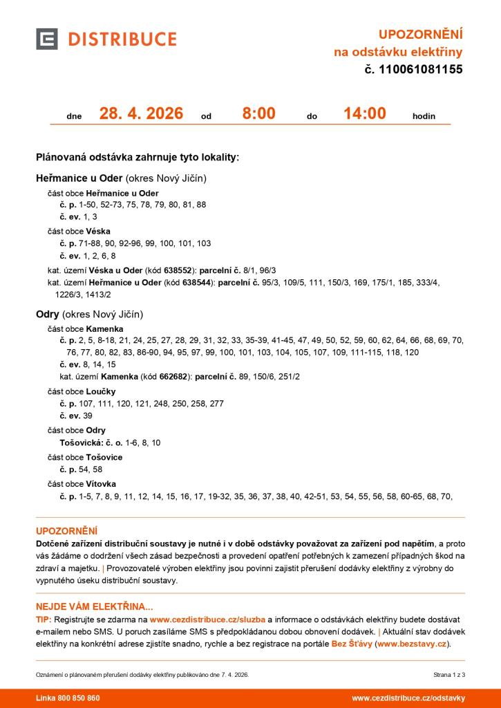 V úterý 28.4.2025 bude celá ves od 8 do 14 h. bez proudu!